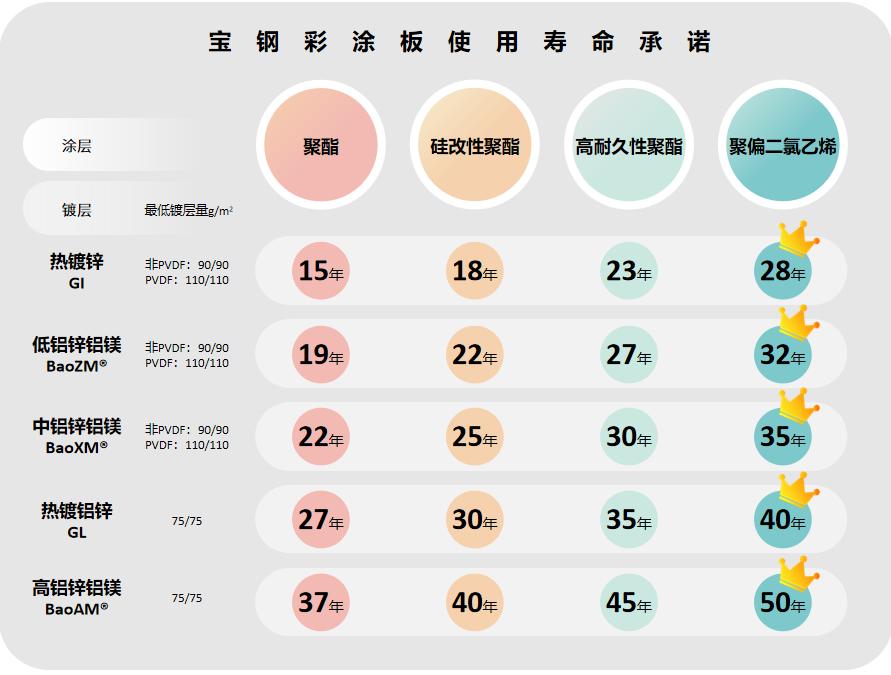 寶鋼鋅鋁鎂鍍層具有優(yōu)異的耐蝕性,代表了鍍層的發(fā)展方向,按鍍層中鋁含量的不同分為低鋁鋅鋁鎂、中鋁鋅鋁鎂和高鋁鋅鋁鎂。
