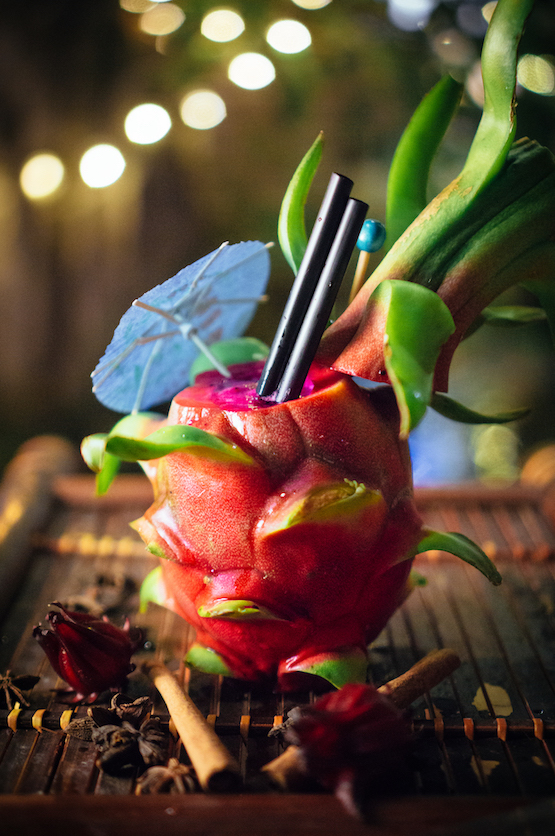 藍色火龍:添加利金酒、茉莉-荔枝糖漿、檸檬和火龍果。