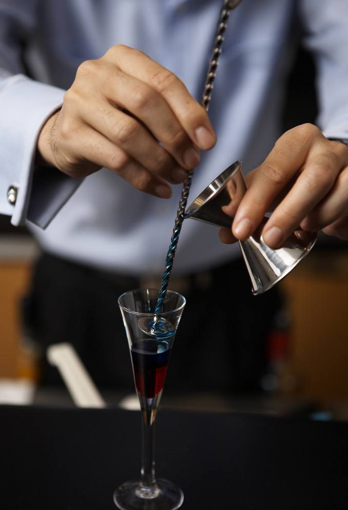 主要用于調(diào)制各款彩虹雞尾酒,調(diào)制要求酒水之間不混合,層次分明,色彩絢麗。分層要熟悉酒水密度,按密度大小從順序倒入。