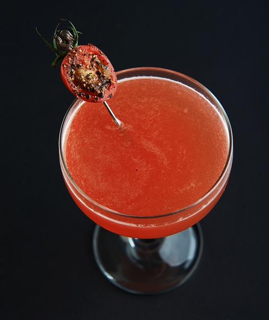 Slice the tomato into segments and muddle in the base of a shaker. Add the rest of the ingredients, shake with ice and double strain into a chilled coupe glass. Garnish with a peppered cherry tomato.