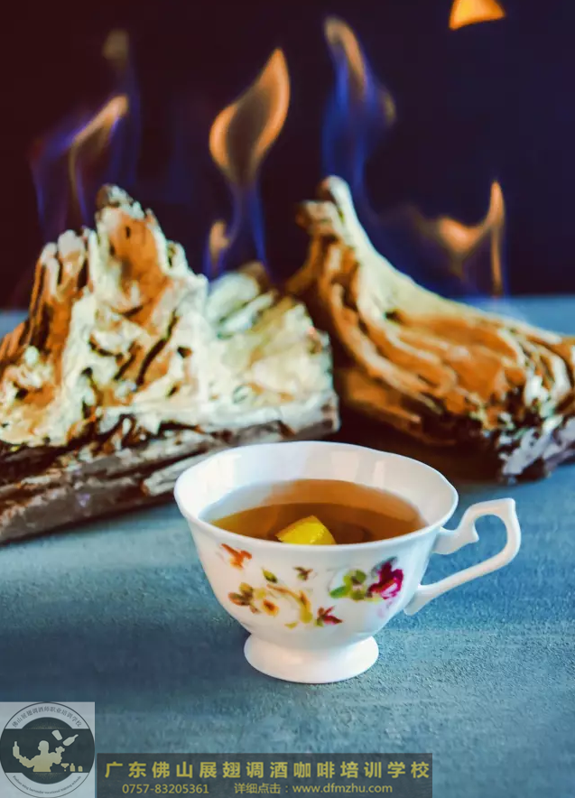 取兩只金屬耳杯,將所有原料倒入其中一只并點燃。用兩只耳杯小心拉制12-15次燃燒的酒液。完全熄滅火焰,濾入古董茶杯,以檸檬皮卷裝飾。